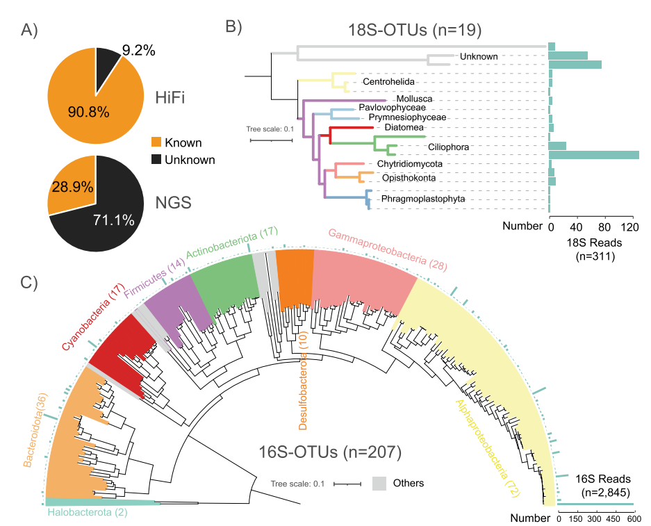基于HiFi reads的分類分辨率。(A) HiFi和NGS讀數(shù)具有(已知)/不具有(未知)分類信息的百分比。(B和C)基于19個全長18S-OTUs (B)和207個全長16S-OTUs (C)的系統(tǒng)進(jìn)化樹